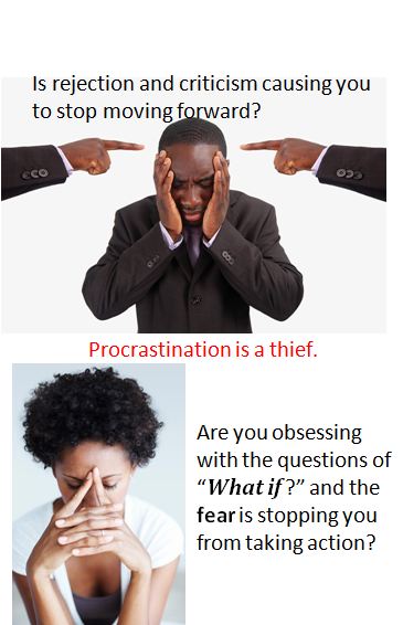 I learned a lesson from this about procrastination.  People often avoid making decisions, taking action or making changes in their life because of past trauma or negative feedback. You may be procrastinating on your dream because you want to avoid pain (i.e. fear of rejection, criticism, failure, embarrassment or loss).         I reveal the other 24 causes of procrastination and some awesome and “do-able” solutions to help you experience progress, satisfaction, results, fulfillment and success on my CD “Who or What is Stopping You?” (Stories, Strongholds and Solutions to Arrest the Thief Called Procrastination – click here to order your own copy)