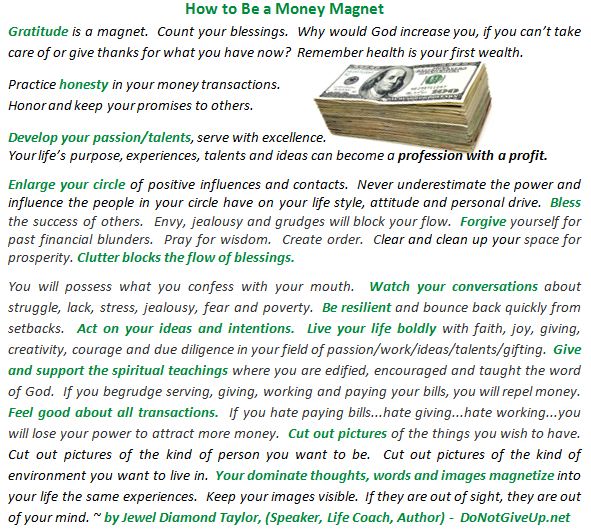 Ways to Become a Money Magnet August 23, 2012 Jewel Diamond Taylor Share this:Share Click to share on Facebook (Opens in new window) Facebook Click to share on Pinterest (Opens in new window) Pinterest Click to share on X (Opens in new window) X Like Loading... Related