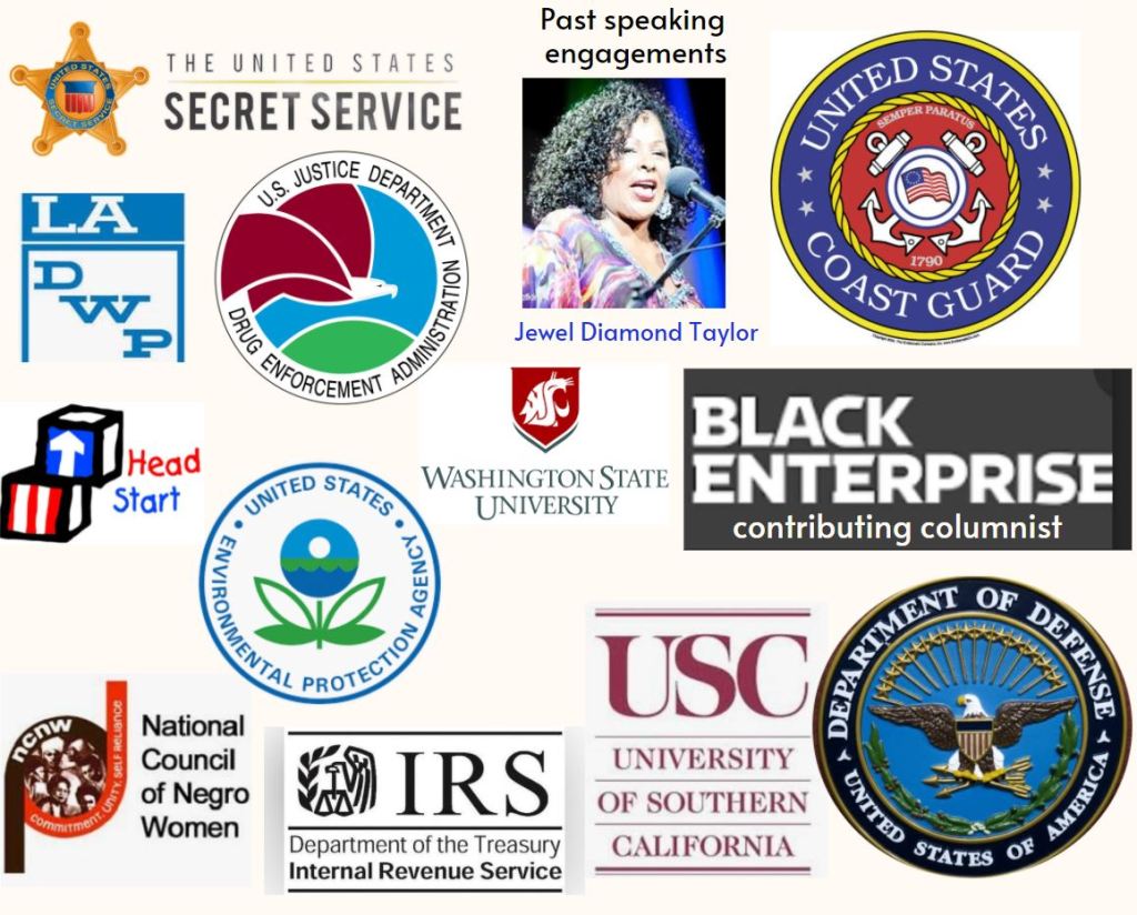 “As a nationwide provider of training and development services, the Graduate School, USDA trains in excess of 150,000 government employees in a variety of topical areas. For several years Jewel Diamond Taylor has participated as a keynote speaker, a workshop presenter and valued colleague for the Graduate School, USDA. In addition to Jewel Diamond Taylor’s prowess as a speaker and workshop presenter, she is easy to work with and very reliable meeting timeline requirements to insure a successful program. Any event planner knows that you need reliable and dependable presenters that cooperate with logistics. Many say they will cooperate…Jewel does! I particularly enjoy Jewel’s clever and imaginative use of symbolism and language in the creation of her program, poetry and publications. This creativity drives home teaching points and allows the session to flow. Jewel has the ability to motivate men and women, young and old, as well as a diverse audience.” ~ Crystal Baker, Program Specialist, Graduate School USDA