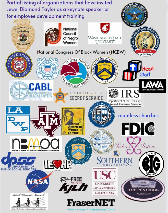 “It is with great pleasure that I recommend Jewel Diamond Taylor as a presenter. Jewel has always displayed a high degree of integrity, responsibility and ambition. This seasoned and energizing speaker connects to any audience quickly speaking to the relevant themes of life with a fresh voice and perspective. In addition to her excellent presentation skills that touch people from all walks of life, she has proven her leadership ability by organizing a support group that provides the guidance for continuous self-evaluation and personal growth. As past National President for the National Organization of Blacks in Government, I am happy to give her my wholehearted endorsement.” ~ Gregory Reeves, Austin, TX